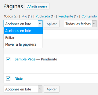 También podemos hacer clic en el cuadrado a la izquierda del título para seleccionarlo, y en la parte de arriba, aparece el menú “Acciones en lote” donde podemos seleccionar la opción “Mover a la papelera” y pinchamos en Aplicar.
