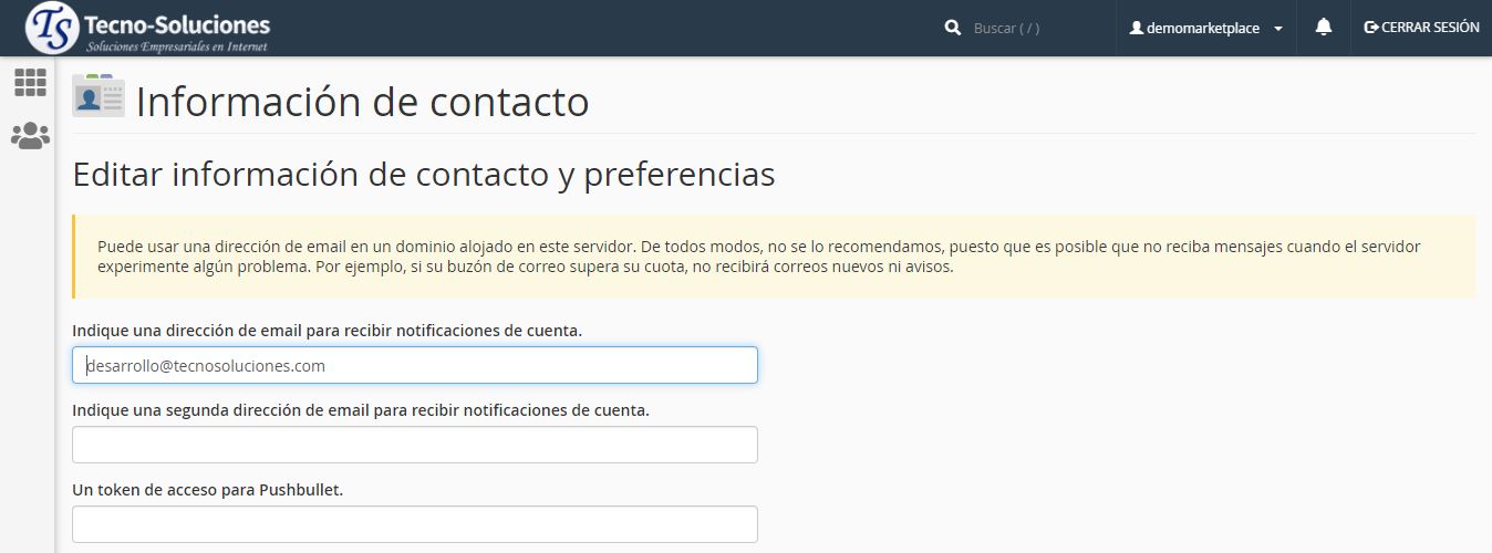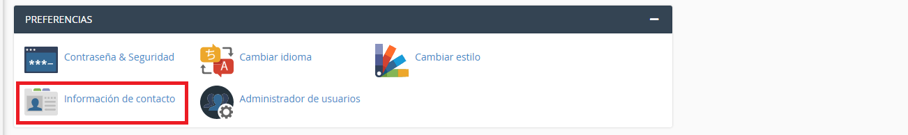 Utilice esta interfaz para almacenar información de contacto para su cuenta de cPanel y para configurar sus preferencias de contacto.