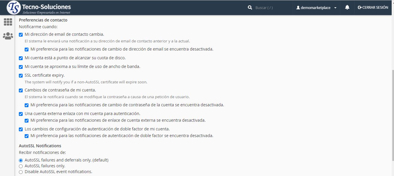 Algunas configuraciones aparecen según el nivel de notificación que su proveedor de alojamiento estableció para usted. Por ejemplo, si su proveedor de alojamiento deshabilita la opción Notificar al usuario para todos los eventos de AutoSSL y la configuración de notificación de éxito normal al usuario , esta configuración no estará disponible.