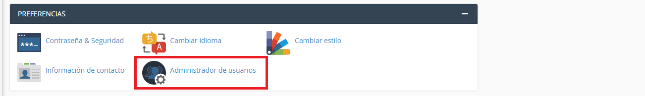 La interfaz del Administrador de usuarios le permite administrar sus subcuentas. Las subcuentas utilizan la misma información de inicio de sesión y contraseña para los servicios de correo electrónico, FTP y Web Disk. El sistema sincroniza la contraseña de cada uno de los servicios permitidos de la subcuenta.