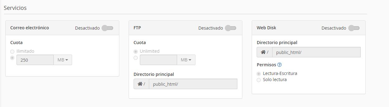 Correo electrónico , FTP y disco web : el acceso de la subcuenta a los servicios de correo electrónico, FTP y disco web, respectivamente.