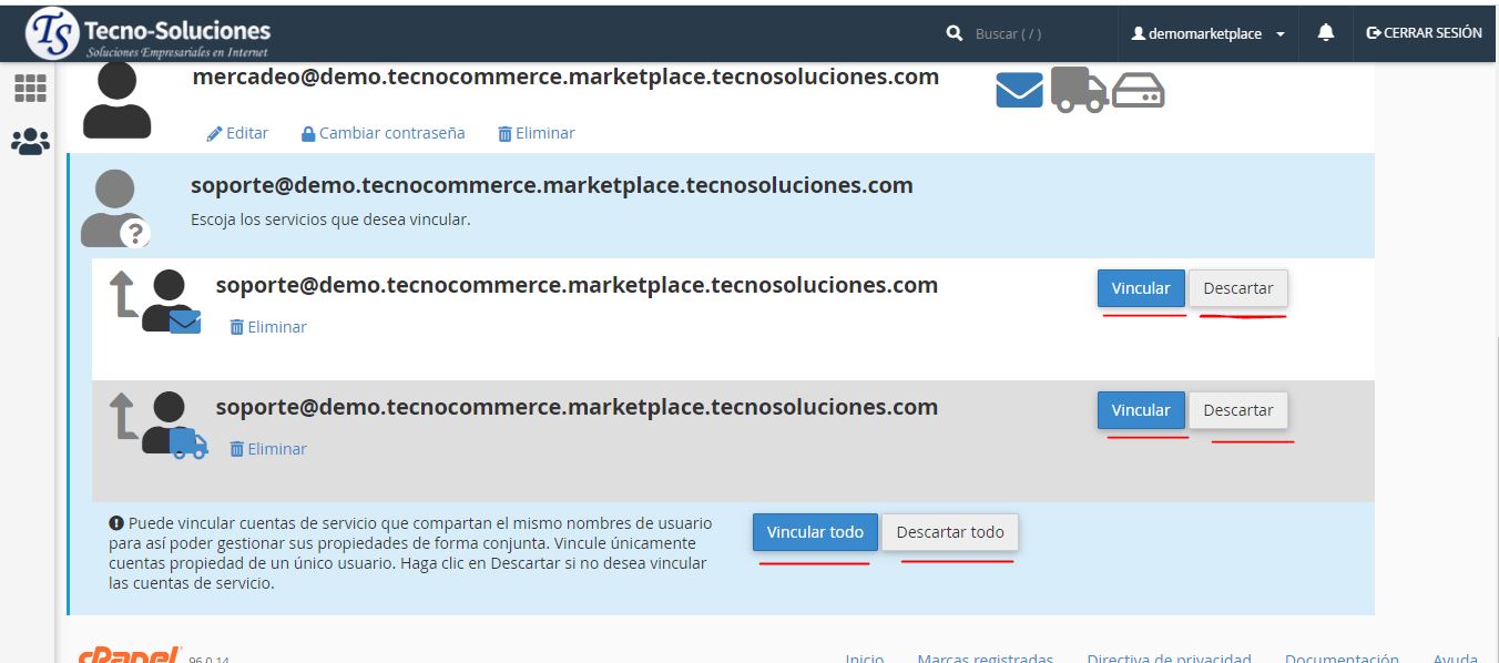 Esta interfaz también le permite combinar cuentas de correo electrónico, FTP y Web Disk en una sola subcuenta o vincular cuentas de servicio existentes a subcuentas.