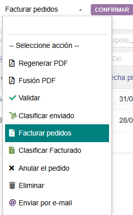 Al hacer clic acá, nos aparecerá un listado de pedidos de clientes pendientes de ser facturados. Para lo cual, se deben seleccionar los Pedidos, escoger la acción Facturar pedidos: