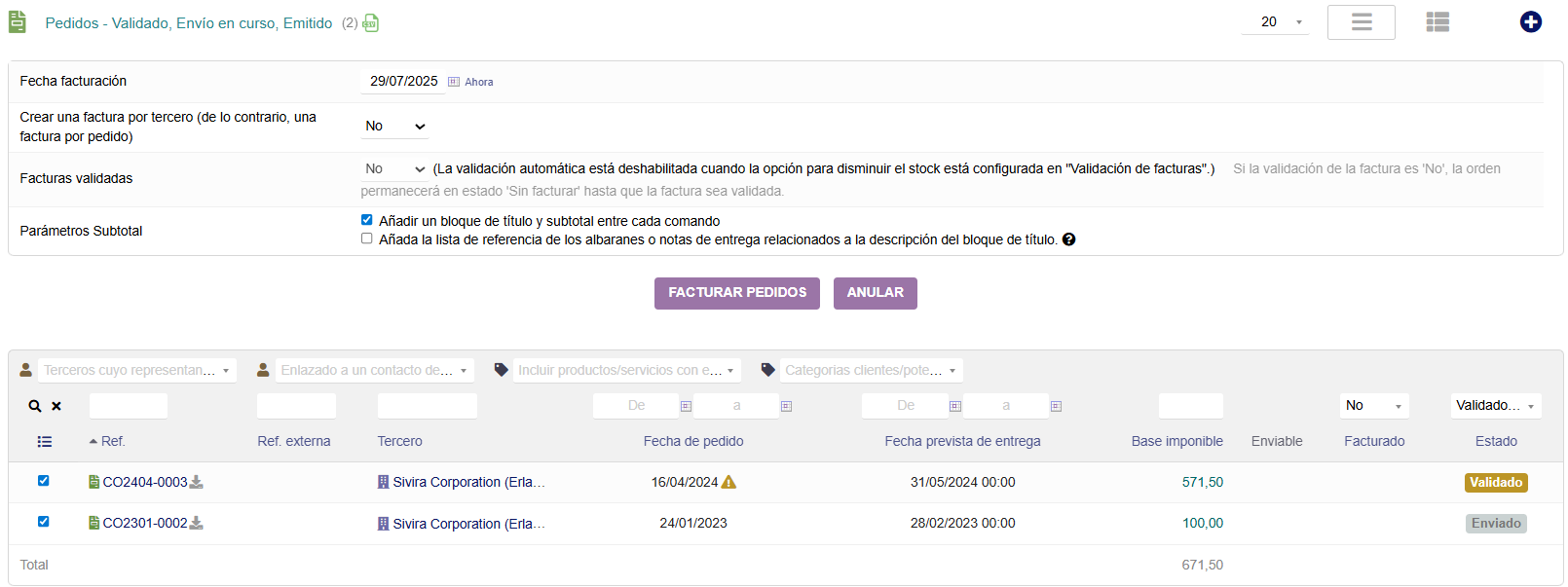 En esta pantalla se nos muestran todos los pedidos pendientes de facturar del tercero. Desde la parte derecha podremos seleccionar los pedidos a los que se le van a emitir las facturas. Al hacer esto, se crean las facturas en Borrador, y el procedimiento a seguir a partir de acá es el ya explicado