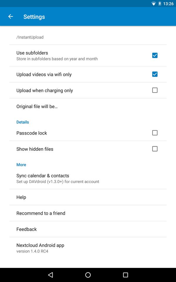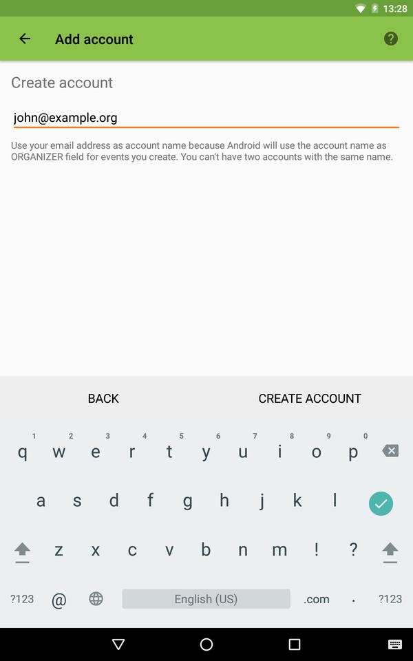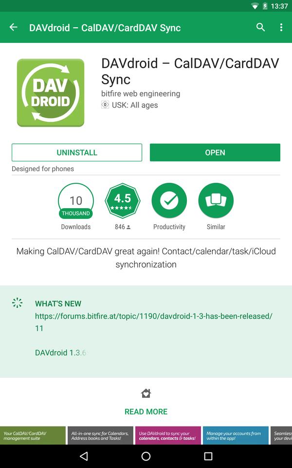 Al hacer clic aquí y la aplicación DAVDroid no está instalada, se abrirá Google Play Store o la tienda F-Droid para permitirle instalar esta aplicación (si ninguna de ellas está instalada, se abre el sitio web de DAVDroid). Esta aplicación proporciona el mecanismo de sincronización para los calendarios y contactos.