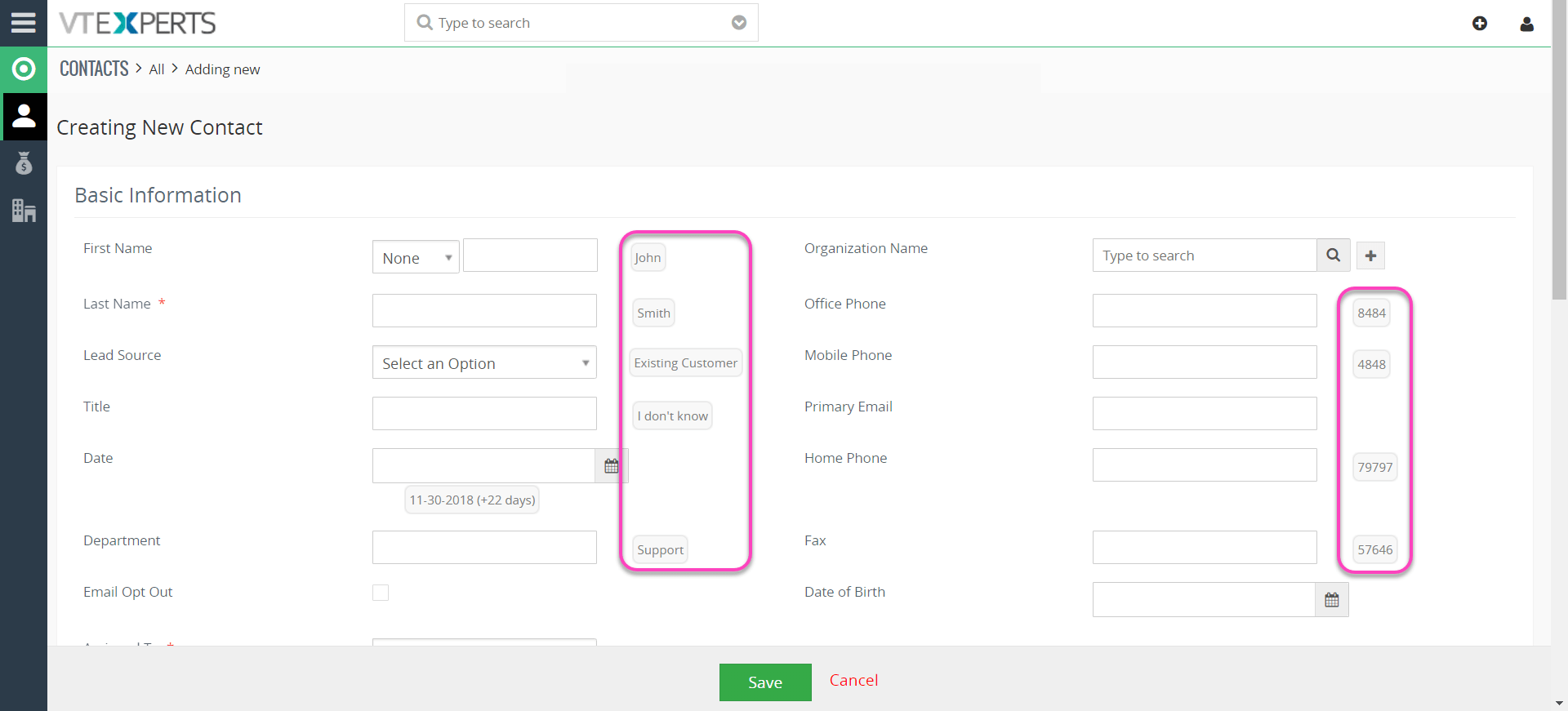 Las predicciones se muestran delante de cada campo como se muestra en la captura de pantalla anterior. Una vez que pasa el mouse sobre una predicción, muestra más predicciones para cada campo. Al hacer clic en una predicción, se completa inmediatamente el valor en el campo, para crear/editar o vistas de resumen/detalle.