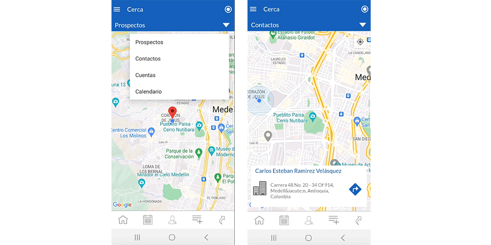 Esto le brinda vistas de mapa de clientes potenciales cercanos, contactos, organización, calendario.