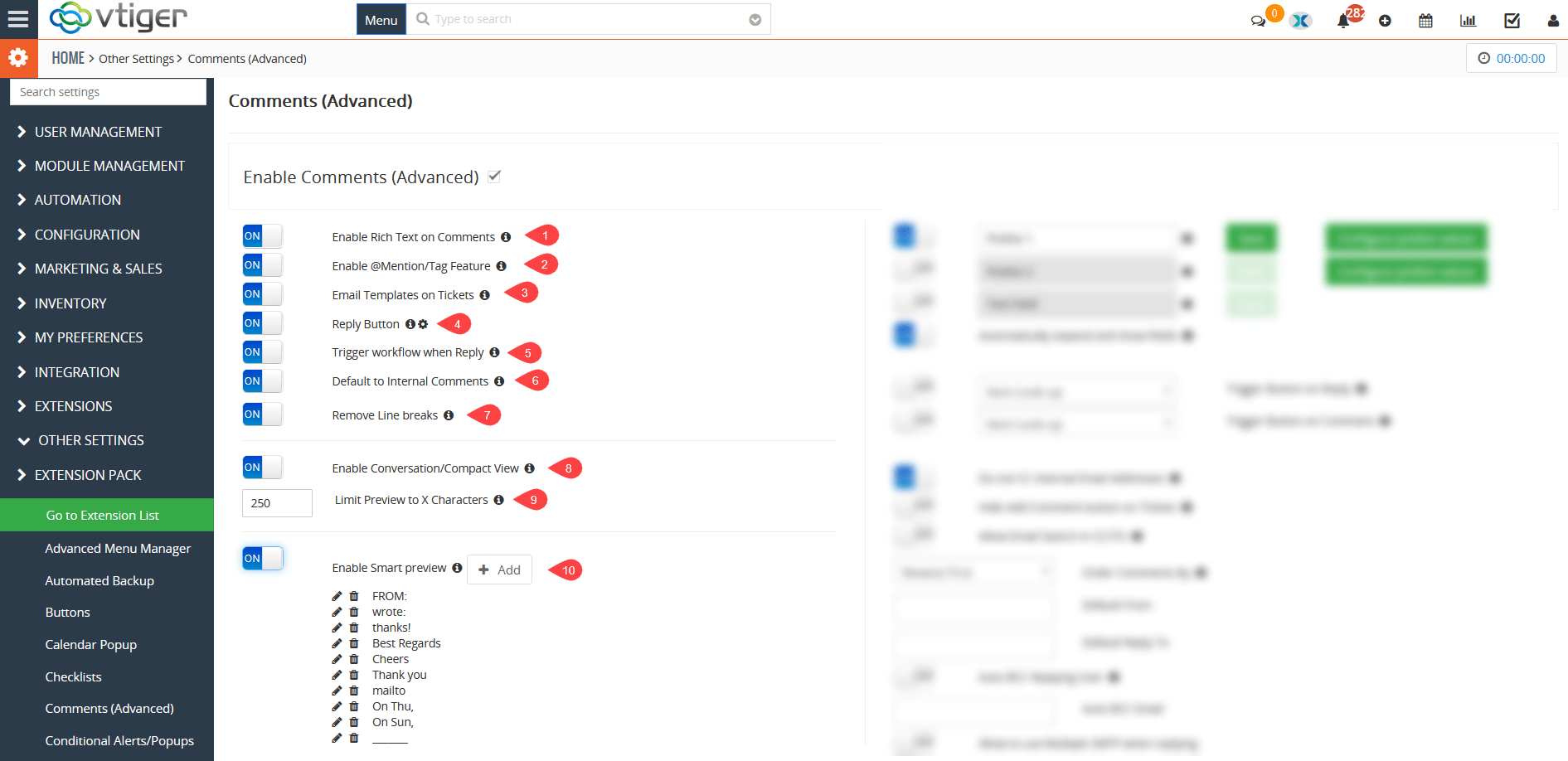Para configurar la extensión de comentarios avanzados para TecnoCRM, abra el menú principal > Configuración > Configuración de CRM > haga clic en “Comentarios (avanzado)” en “TecnoCRM Premium”.