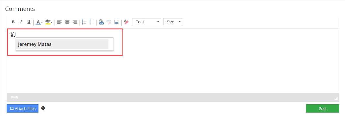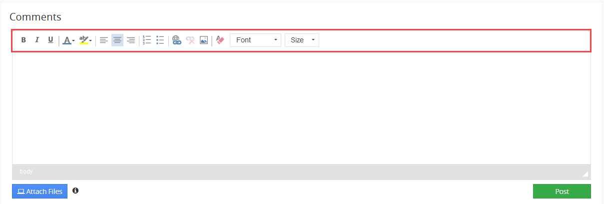 - Habilitar texto enriquecido en comentarios: el usuario puede agregar comentarios usando formato de texto enriquecido, brindando opciones como negrita, cursiva, subrayado, tablas, colores, etc. Para acceder al editor de texto, simplemente haga clic en la sección de comentarios.