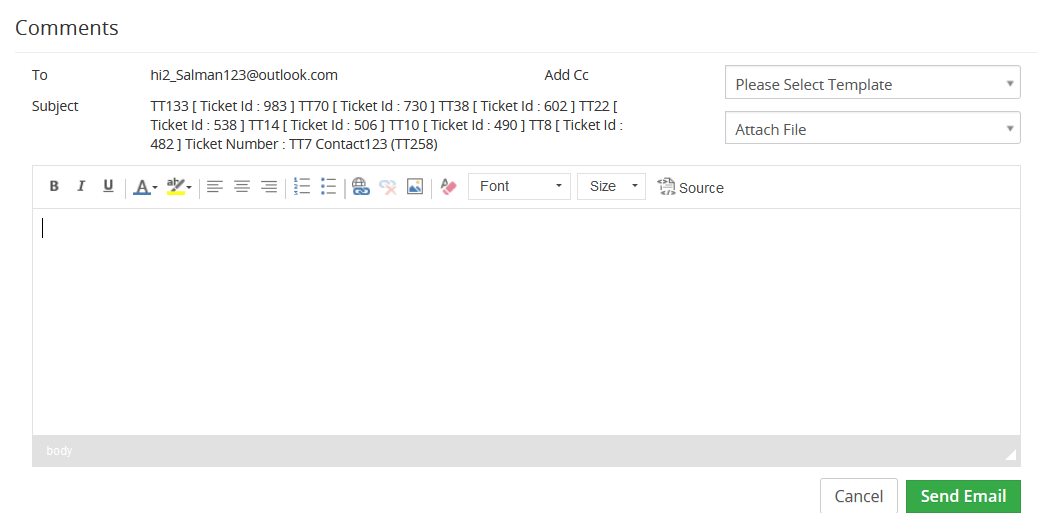 3. Plantillas de correo electrónico en tickets: Al habilitar esta opción, cuando el usuario agrega un comentario en el módulo de ticket, el editor de comentarios abrirá una plantilla de correo electrónico. Esta función es exclusiva de las entradas.