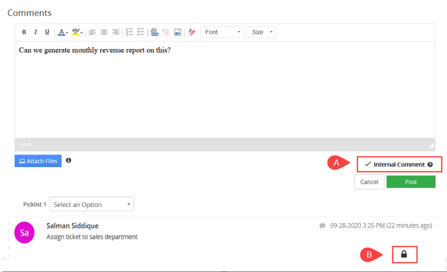 6. Comentarios internos predeterminados: si esta opción está activada, los comentarios se establecerán solo como internos (solo el usuario interno de CRM podrá ver el comentario). El usuario tiene la opción de marcar o desmarcar la casilla antes de publicar el comentario. Esta función es exclusiva de las entradas.