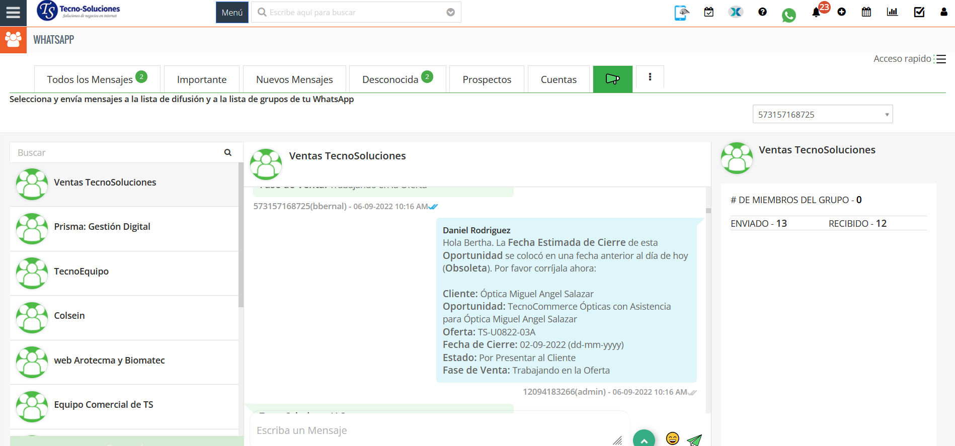 - La mensajería global de WhatsApp tiene la misma opción que enviar/recibir mensajes a registros individuales