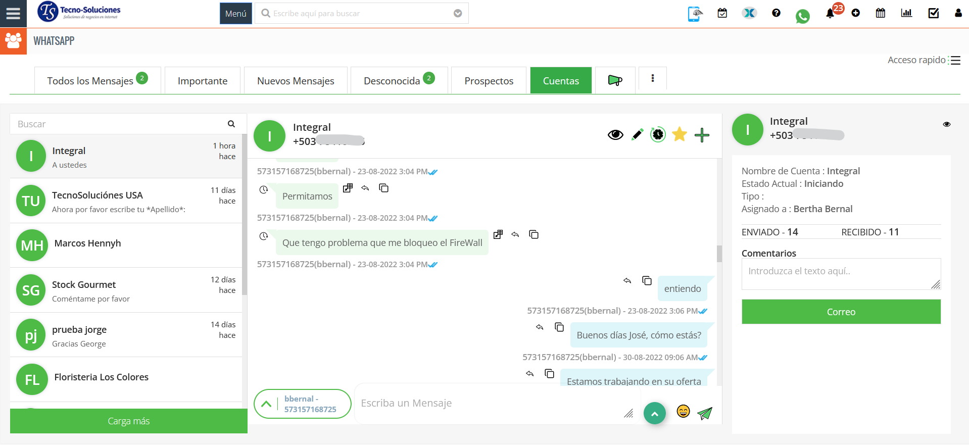 - “Lista de módulos” en el área de visualización de la línea de tiempo de WhatsApp, el usuario puede enviar/recibir mensajes contra el registro de módulos, habilitado desde la configuración de WhatsApp en TecnoCRM.