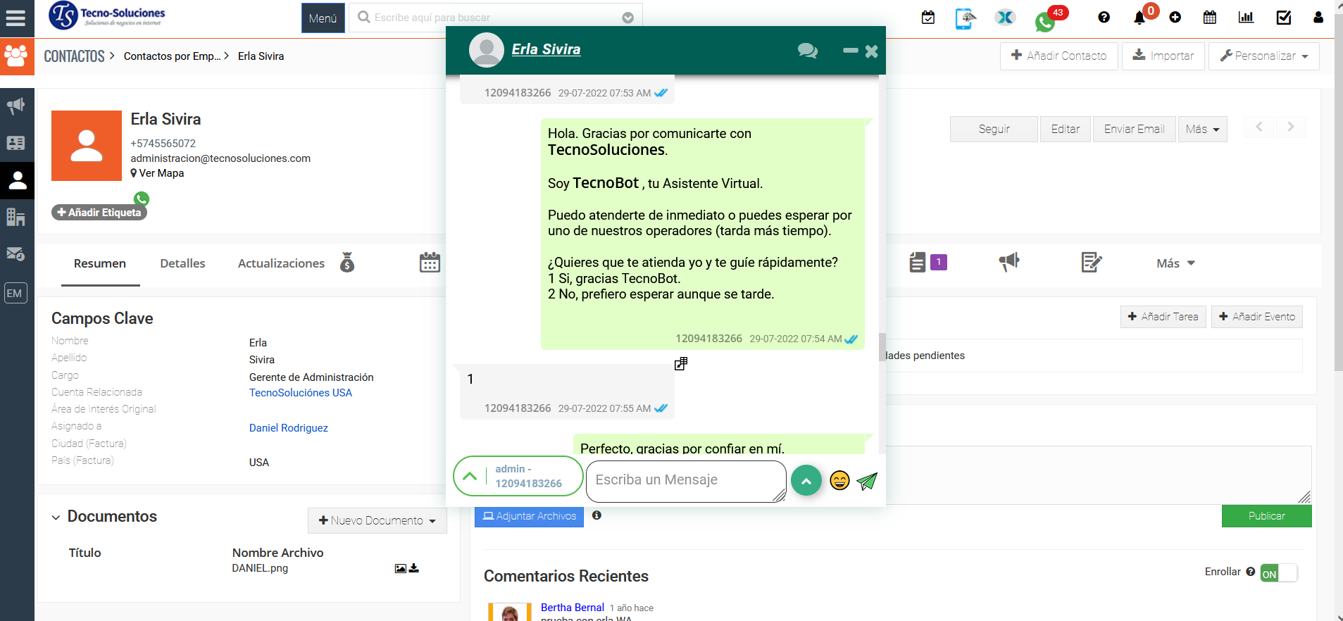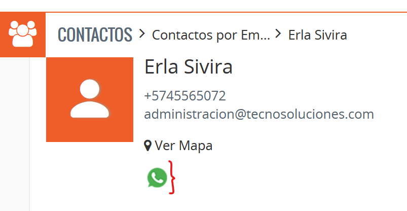 - Al hacer clic en el ícono de WhatsApp, se abrirá la ventana de Chat para comunicarse entre el contacto y el usuario.
