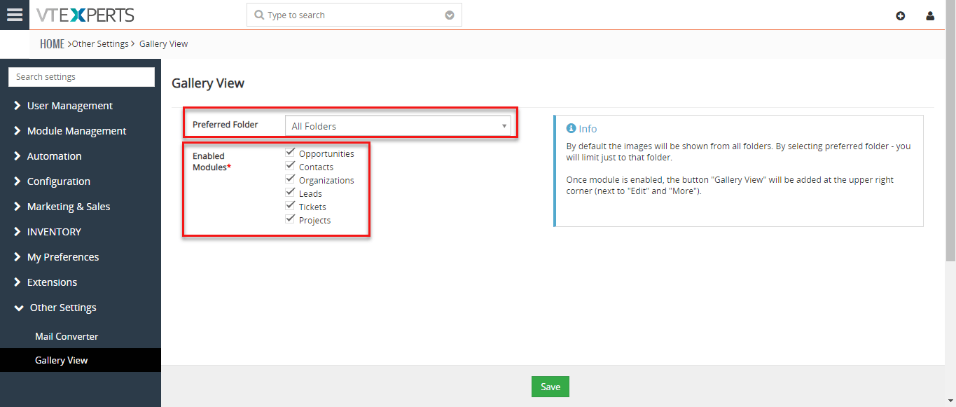 Habilitar módulos: Una vez que el módulo esté habilitado, se agregará el botón ” Vista de galería “. Marque la casilla de módulos deseados para habilitarlo (también módulos personalizados).