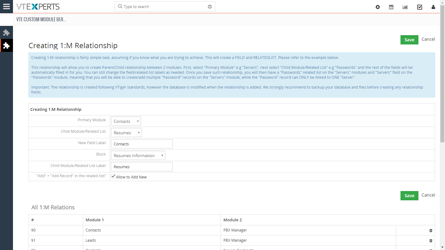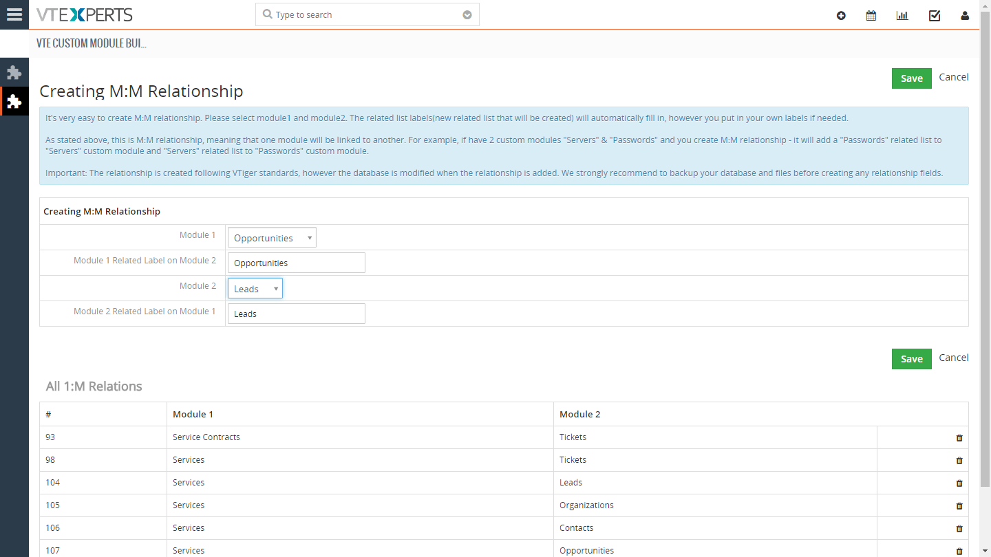 TecnoCRM Custom Module & Relationship builder es una extensión que permite a los administradores de CRM crear módulos personalizados con unos pocos clics. Todos los módulos personalizados se crean siguiendo los estrictos estándares de TecnoCRM. Además, el generador de relaciones permite que el administrador de CRM vincule los módulos existentes, así como los nuevos módulos personalizados. Admite relaciones unidireccionales, 1:M y M:M.