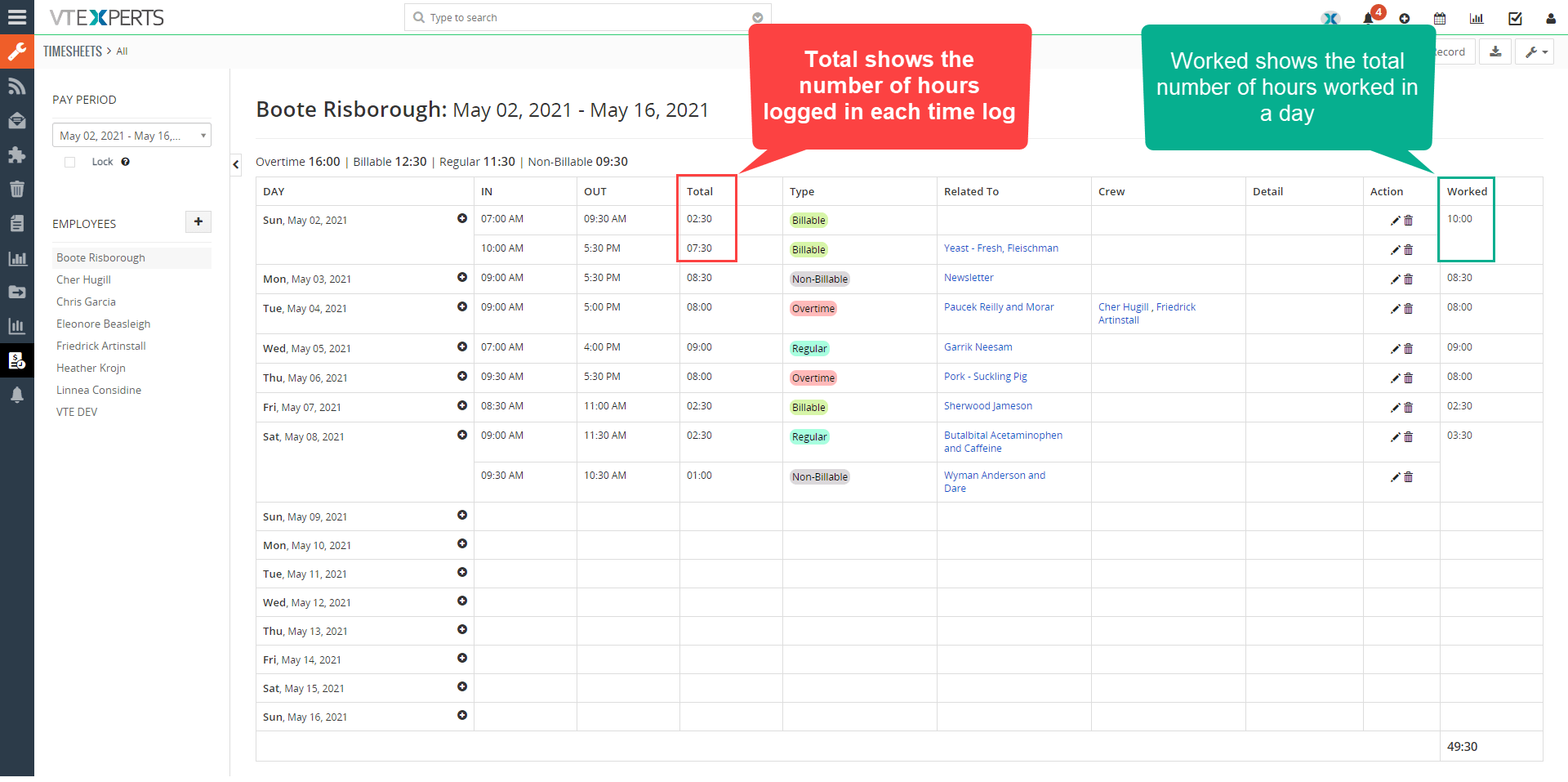 El total muestra el número de horas en cada entrada de registro de tiempo, mientras que el trabajado muestra el número total de horas trabajadas en cada día.