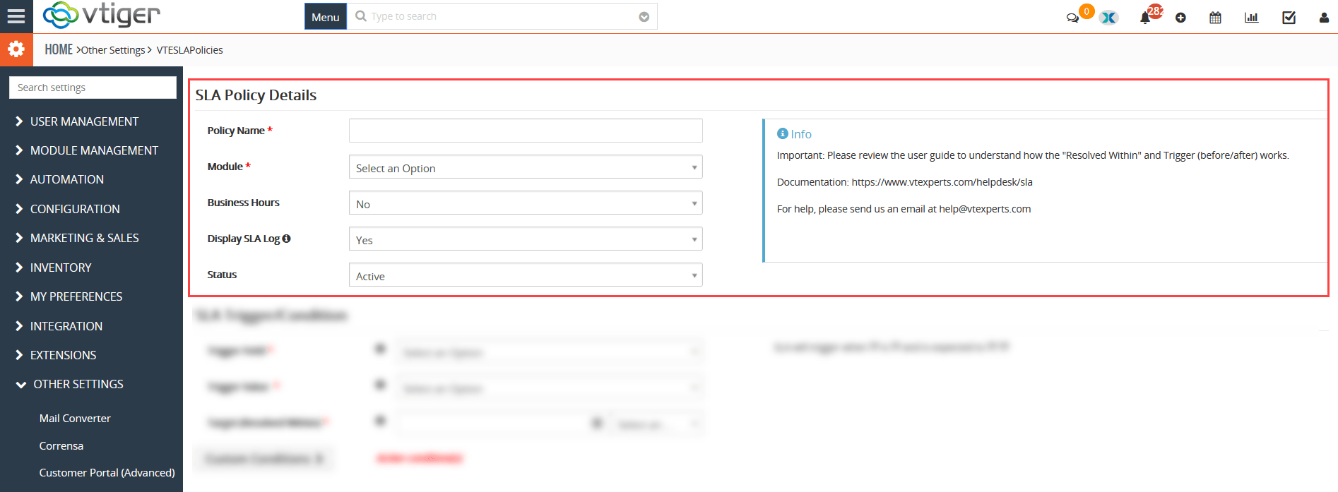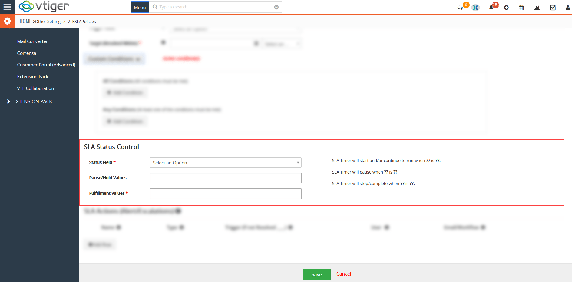 La extensión se puede configurar yendo a Configuración de CRM > Paquete de extensión > Políticas de SLA.