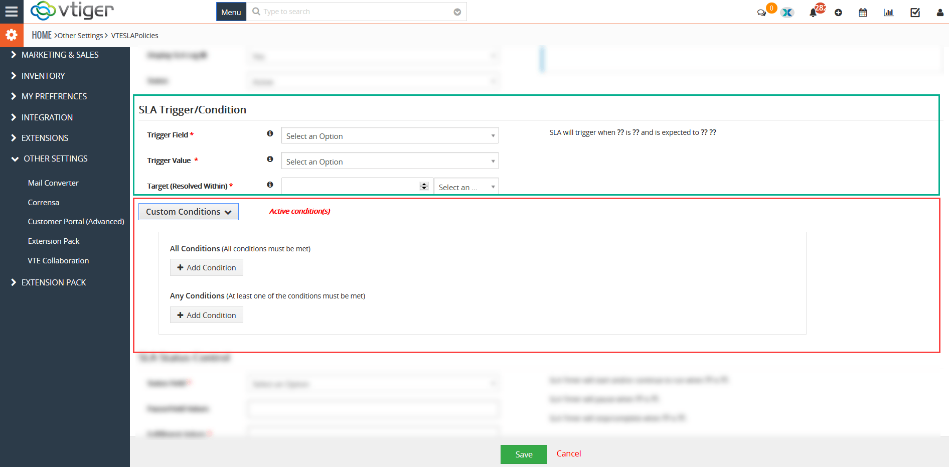 Use también puede agregar condiciones personalizadas o condiciones adicionales que deben cumplirse para que un registro (boleto en nuestro ejemplo) sea elegible para SLA. Por ejemplo (si Estado = Abierto, eso significa que el estado del ticket debe configurarse como abierto y no puede marcarse como SLA a menos que se cumpla esta condición).