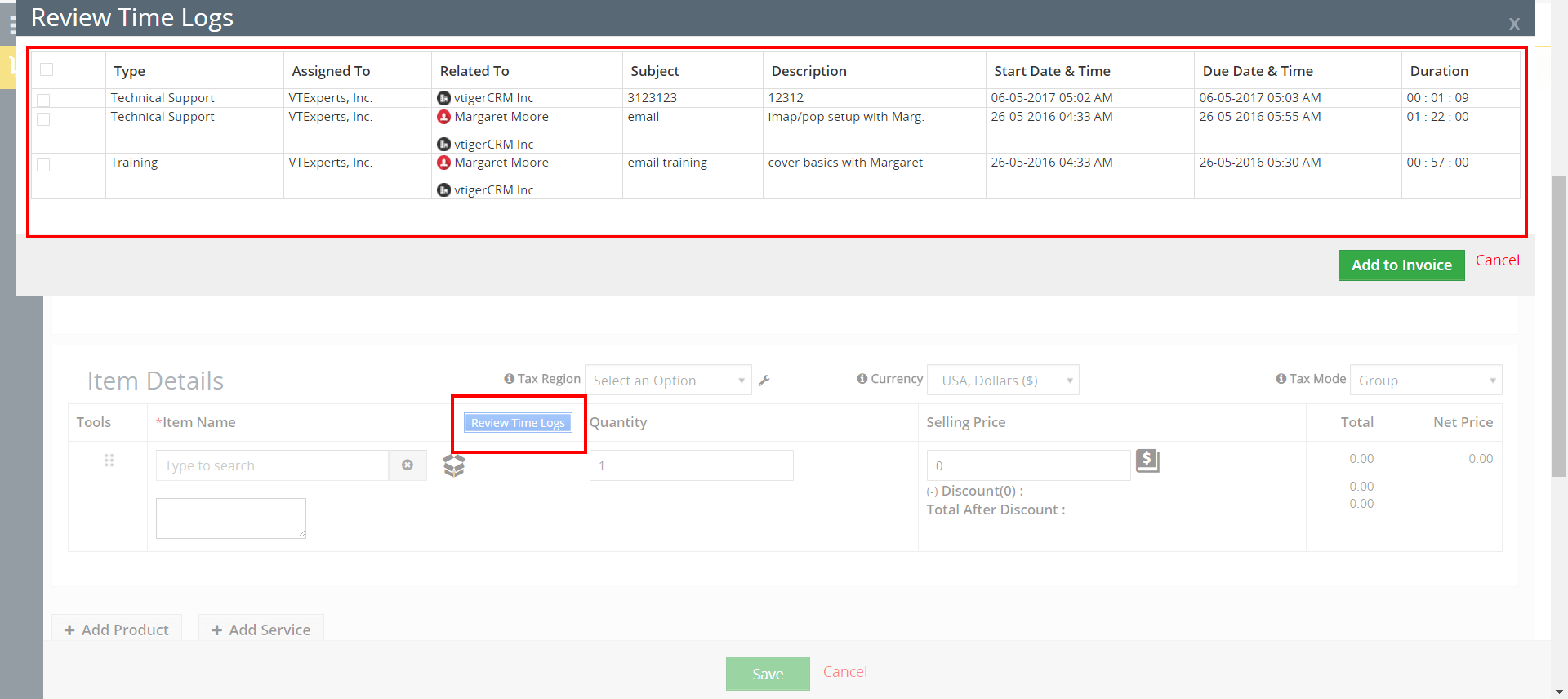 Seleccione los registros de tiempo que desea agregar a la factura.