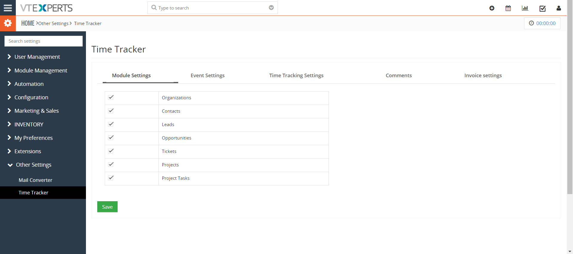 Configuración del módulo: Elija los módulos para los que se habilitará el rastreador de tiempo. Simplemente marque/desmarque los módulos para habilitarlos o deshabilitarlos desde el módulo.