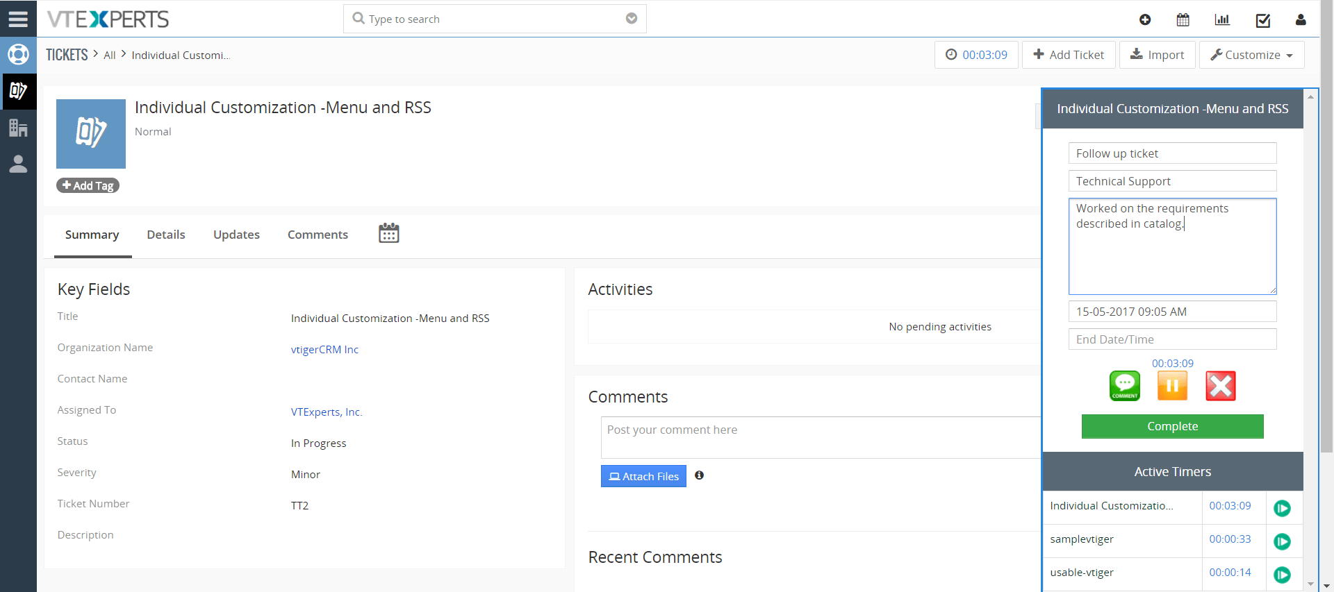 Completo: Para detener el temporizador y registrarlo en el registro de tiempo. Después de que se haya completado un cronómetro, el comentario y la actividad de ese registro se agregarán a las secciones respectivas de ese registro.