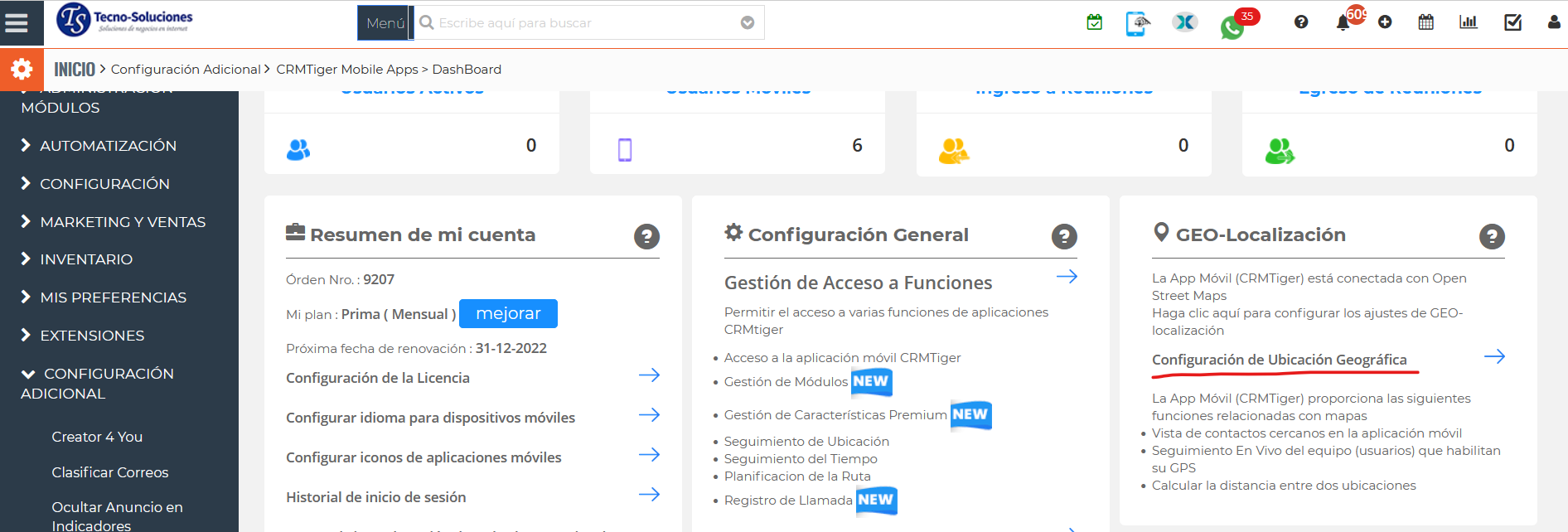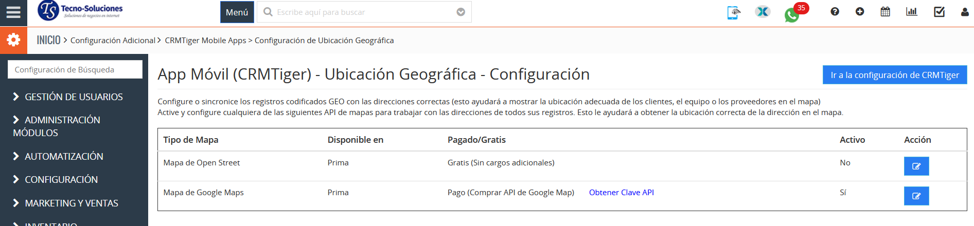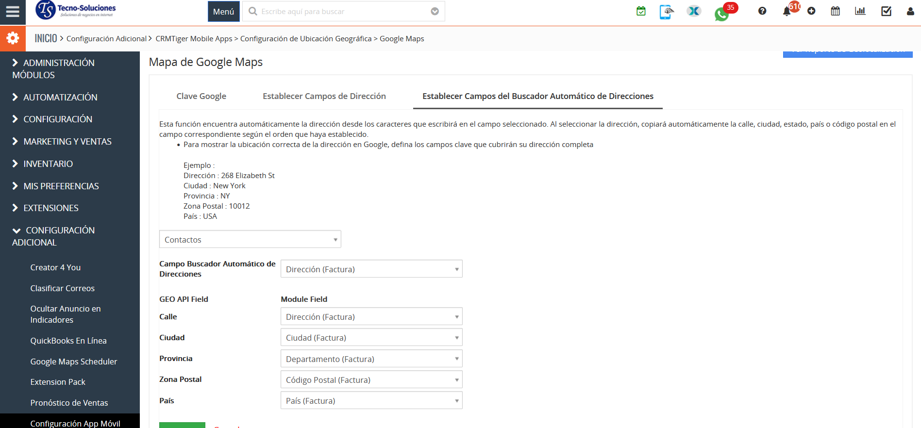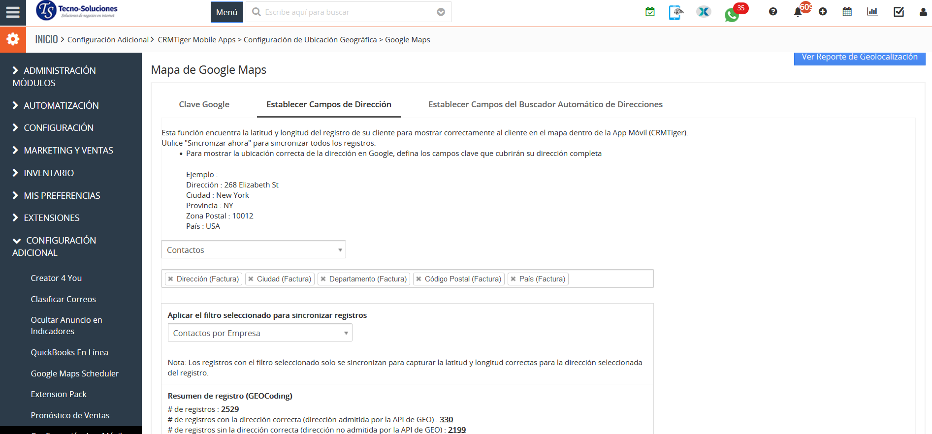 Configuración de GEO (ubicación) Le permite codificar GEO (por ejemplo, establecer latitud/longitud) todos los registros en TecnoCRM que contienen direcciones. Esta es una configuración importante para utilizar todas las funciones de Maps en TecnoCRM Mobile Apps.